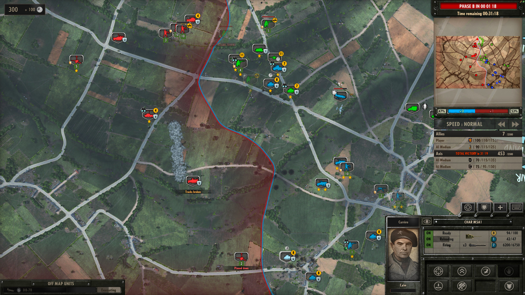 魅力としてまず挙げられるのが兵士を一人一人操作できることや車両へのダメージ判定の複雑さです。特に車両は前後左右のような簡素な分類ではなく、ほぼ実物通りの装甲値が設定されています(例えば戦車の主砲防盾と砲塔前面、ターレットリングでは全て判定が異なります)。撃つ側の砲の貫通力によっては特定の部位でなければ貫通しないということです。加えてエンジン、主砲、ターレットリング、弾薬庫、乗員の殺傷といった細かい判定が行われるので、運悪く貫通した砲弾が弾薬庫に当たればどんな重戦車でも一撃で爆散します。また実物通り上面装甲は薄いため、重砲の榴弾でも直撃すれば戦車を破壊できるような仕組みになっています。ユニットには燃料・弾薬の概念もあるため、戦場の全てに目を配ってユニットを失わないようにする必要があります。