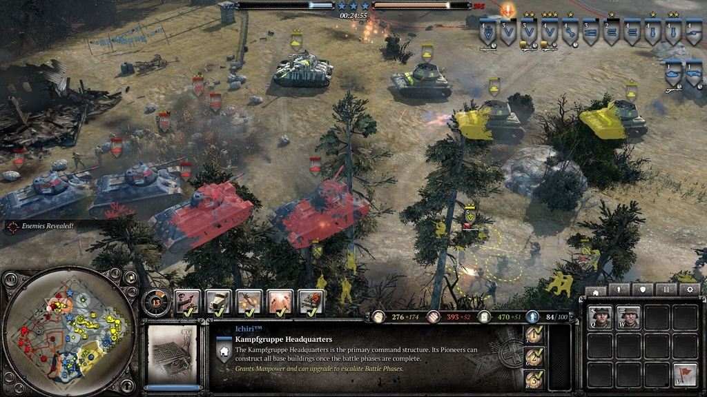 CoH2の対人戦(或いは対AIスカーミッシュ)では双方が基礎歩兵と軽車両等を生産可能な自陣拠点を持った状態からスタートします。マップ上には10前後のエリアと勝利点エリアが存在し、より広いエリアと勝利点の獲得を巡って戦うことになります。資源には3種類あり、ベースとなるマンパワーの他にエリアを獲得することで得られる燃料・弾薬が存在します。燃料は車両の生産で、弾薬はグレネードや砲撃など、アビリティの使用で主に必要になります。