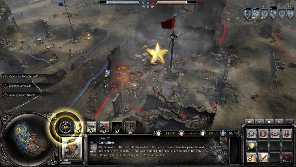 資源を使うことでより強力なユニットを生産できるようになる”テックアップ”(所謂時代進化。ティア4までの4段階)をしつつエリアのコントロールを握り、勝利点または敵陣の完全破壊、相手の降伏による勝利を得ることを目指して試合は進行していきます。