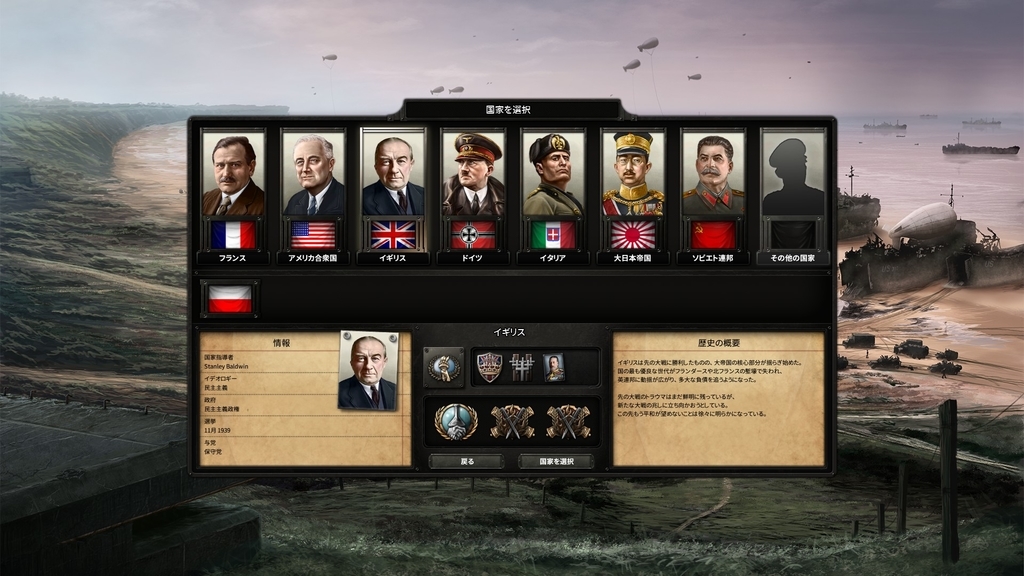 ゲームは1936年開始または1939年開始から選ぶことが出来ます。プレイヤーはプレイしたい国を選択し(ドイツやアメリカのような強国から、エチオピアのような絶望的状況の国まで選ぶことが出来ます)、やがては戦争へと向かう世界へ身を投じることになります。今作では大戦へと向かう世界情勢を表現するために「国際緊張度」というシステムが用意されており、スペイン内戦やドイツによるラインラント進駐のようなイベントが発生するに応じて緊張度は上昇していきます。緊張度が上昇するに伴って、各国が取ることの出来る行動の幅も広がるシステムになっています(例えば他国の戦争への義勇兵派遣など)。
